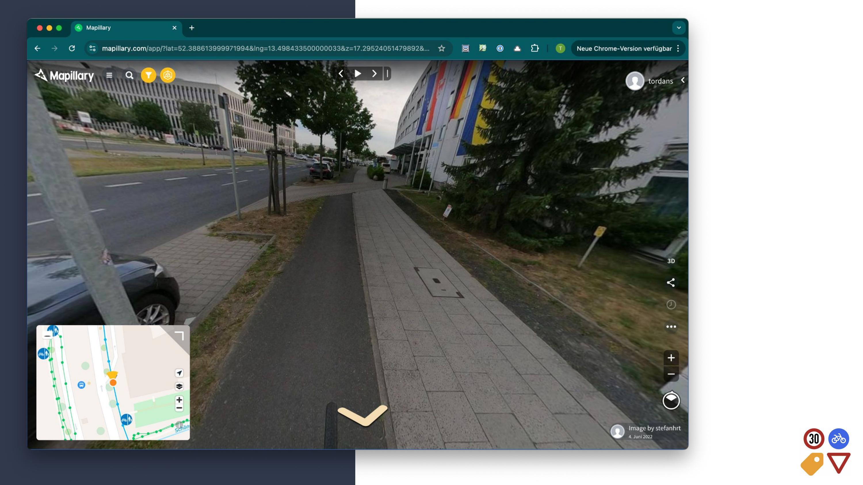 Mit Mapillary können wir das Verkehrszeichen überprüfen und die Daten in OSM korrigieren: