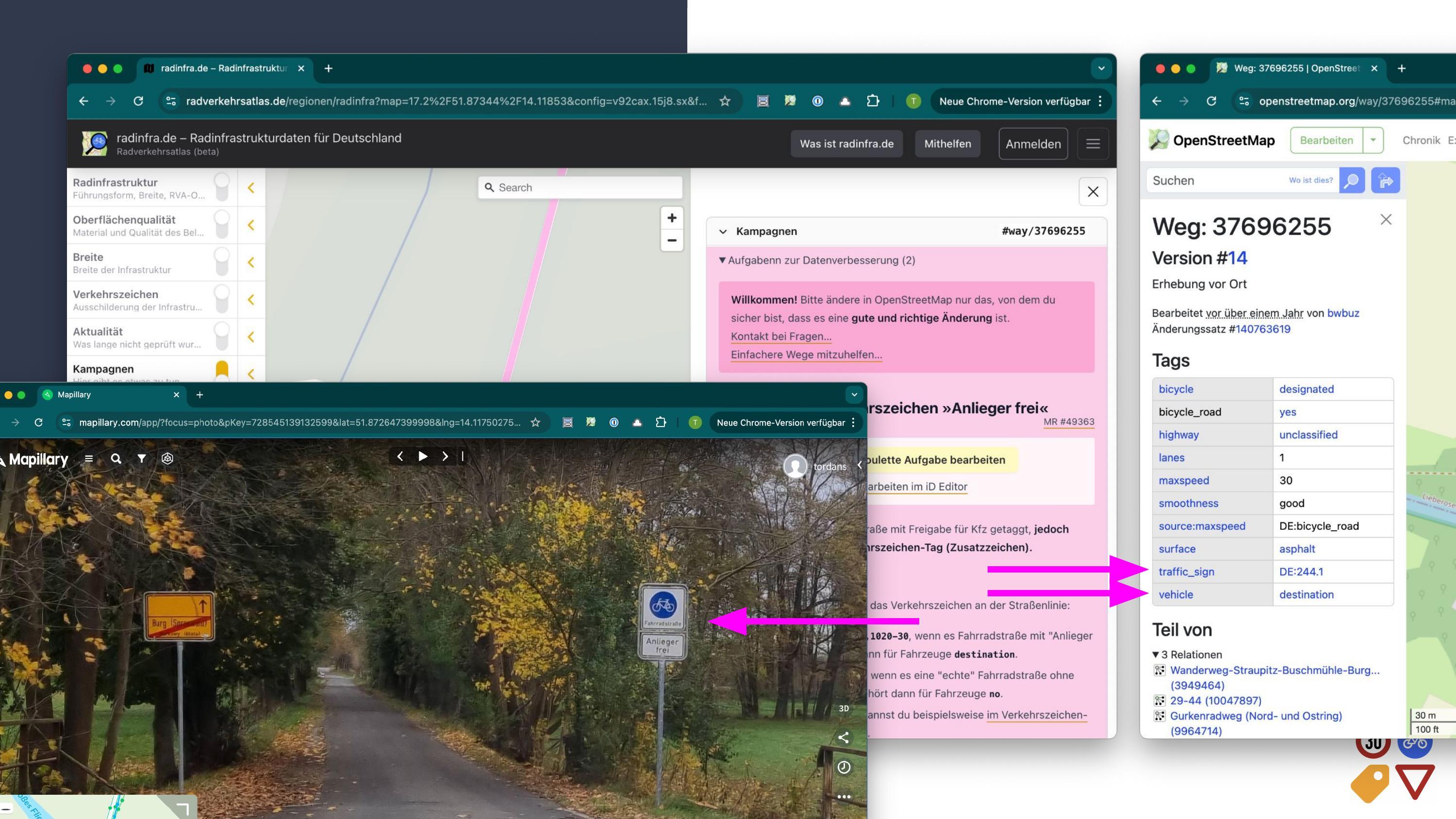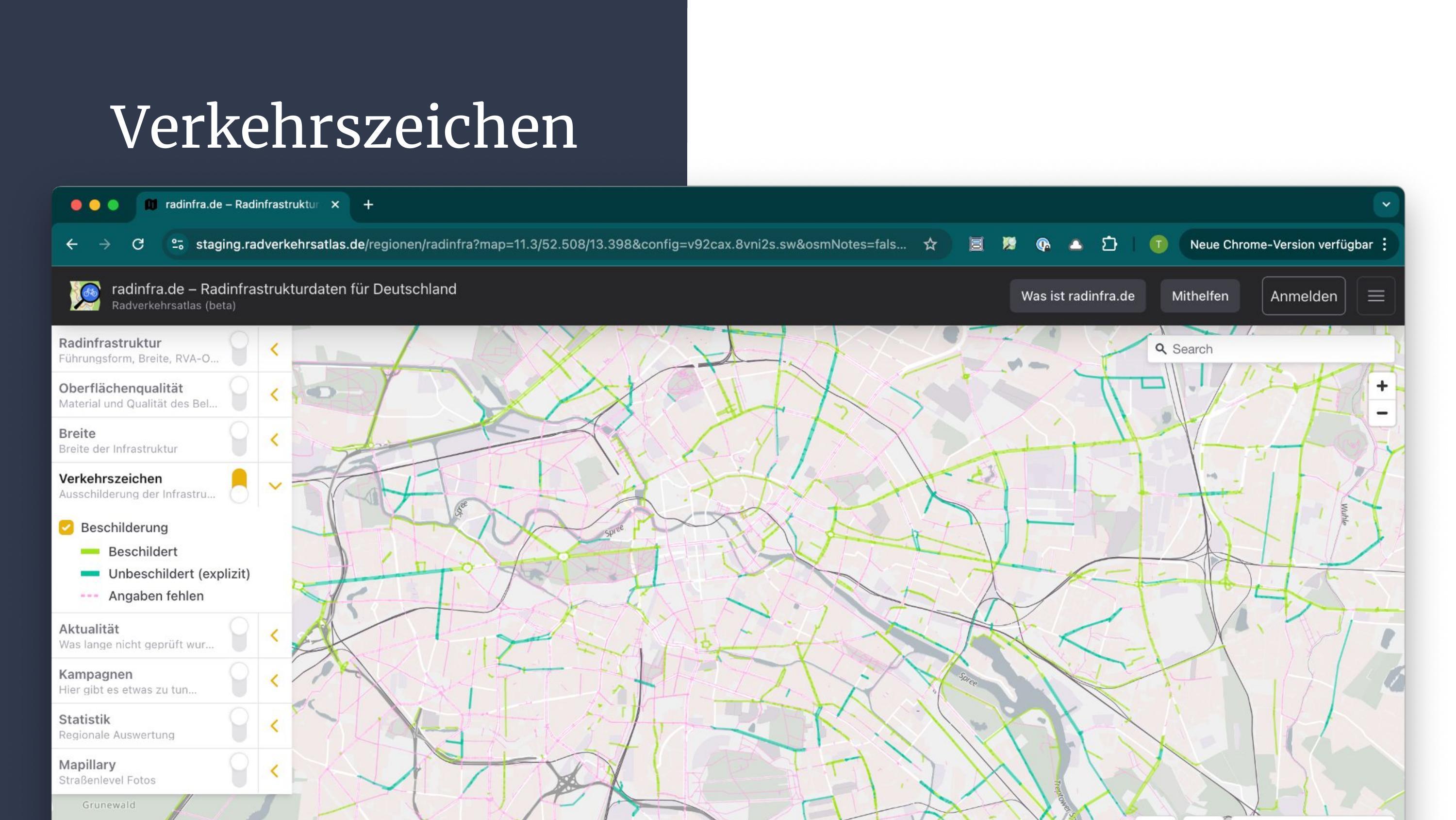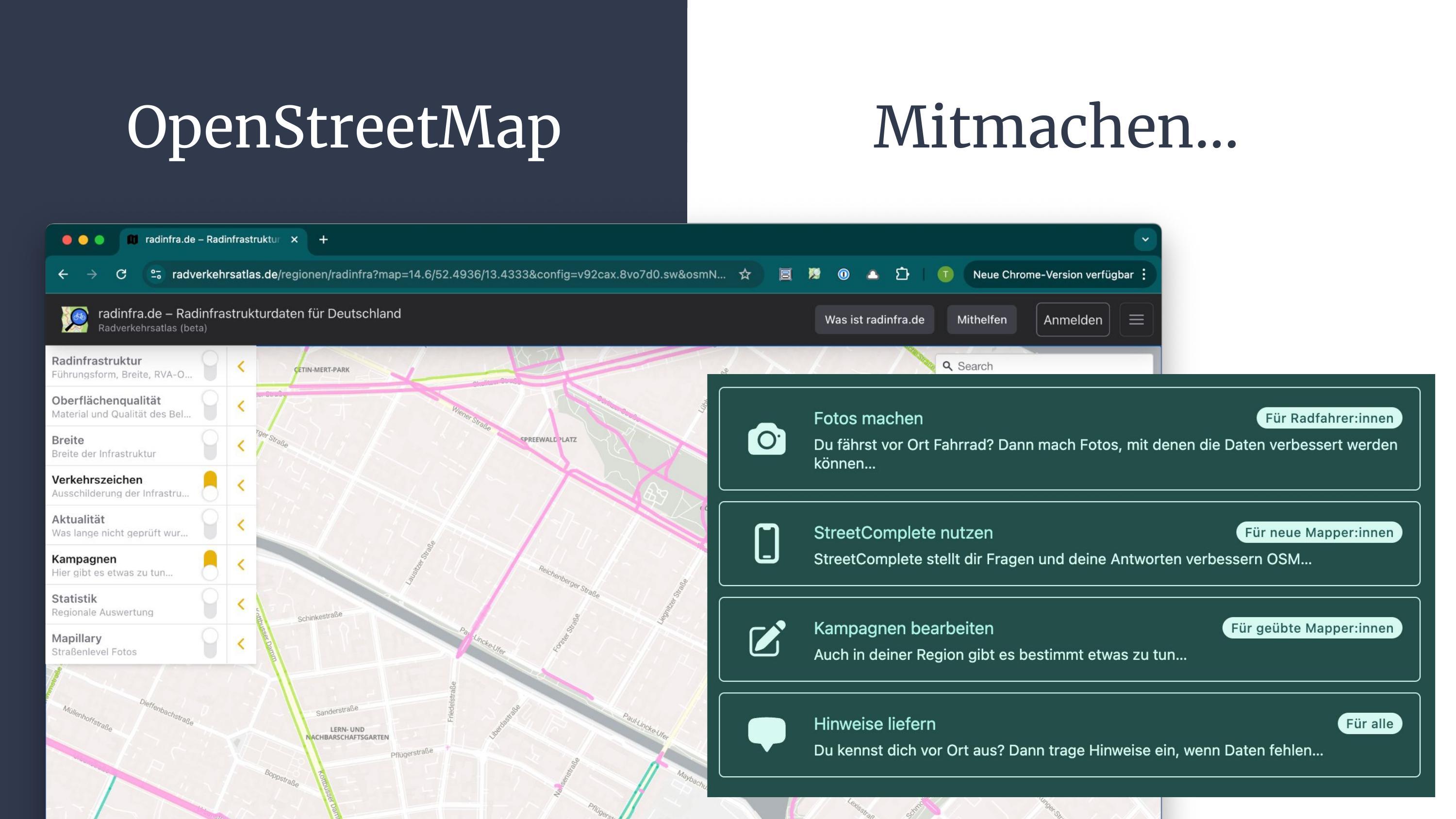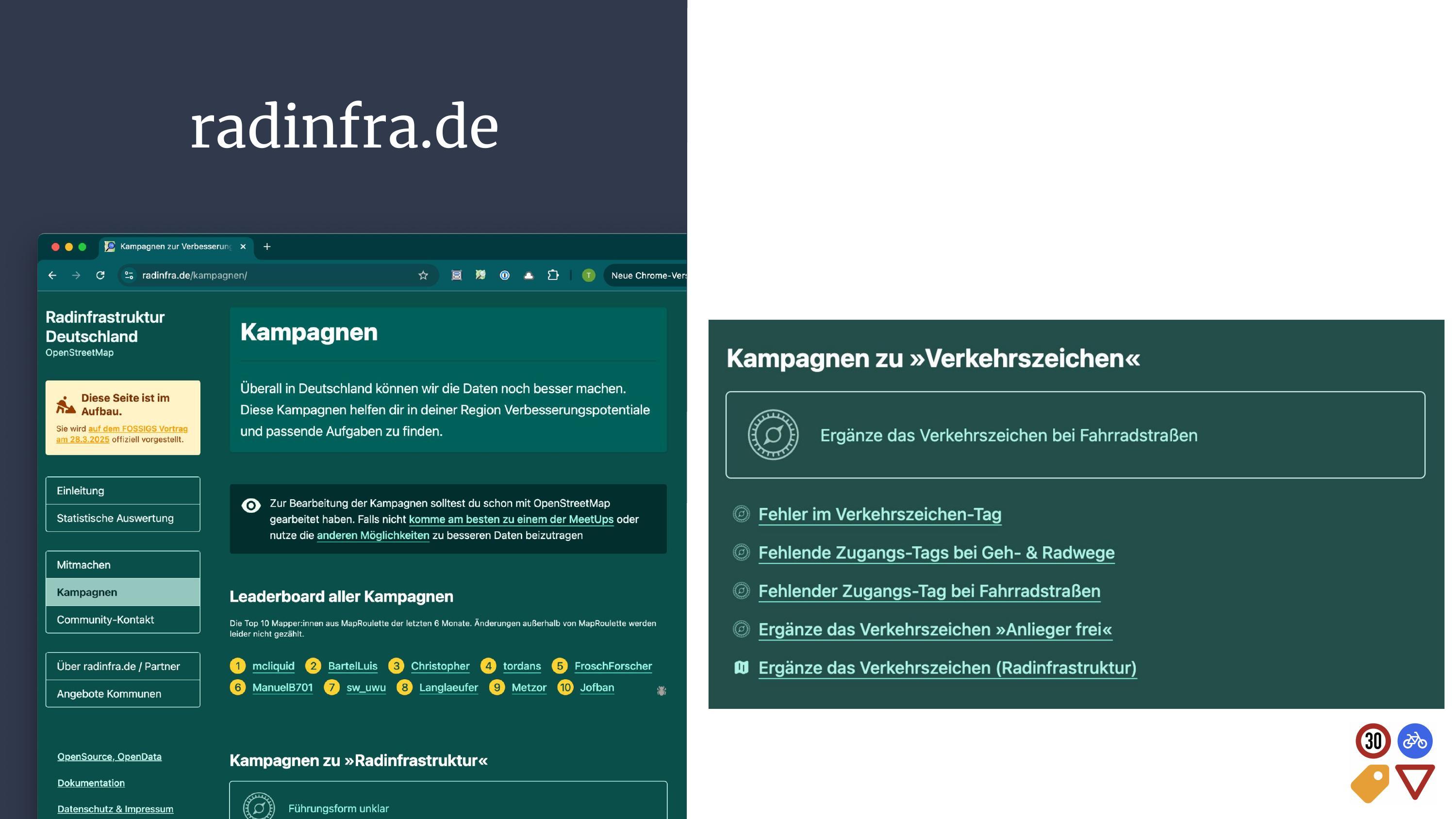 Ich lade euch ein, euch diese Woche etwas Zeit zu nehmen und auf radinfra.de vorbeizuschauen. Dort findet ihr verschiedene Möglichkeiten, um zu OSM beizutragen – unter anderem unsere Verkehrszeichen-Kampagnen.