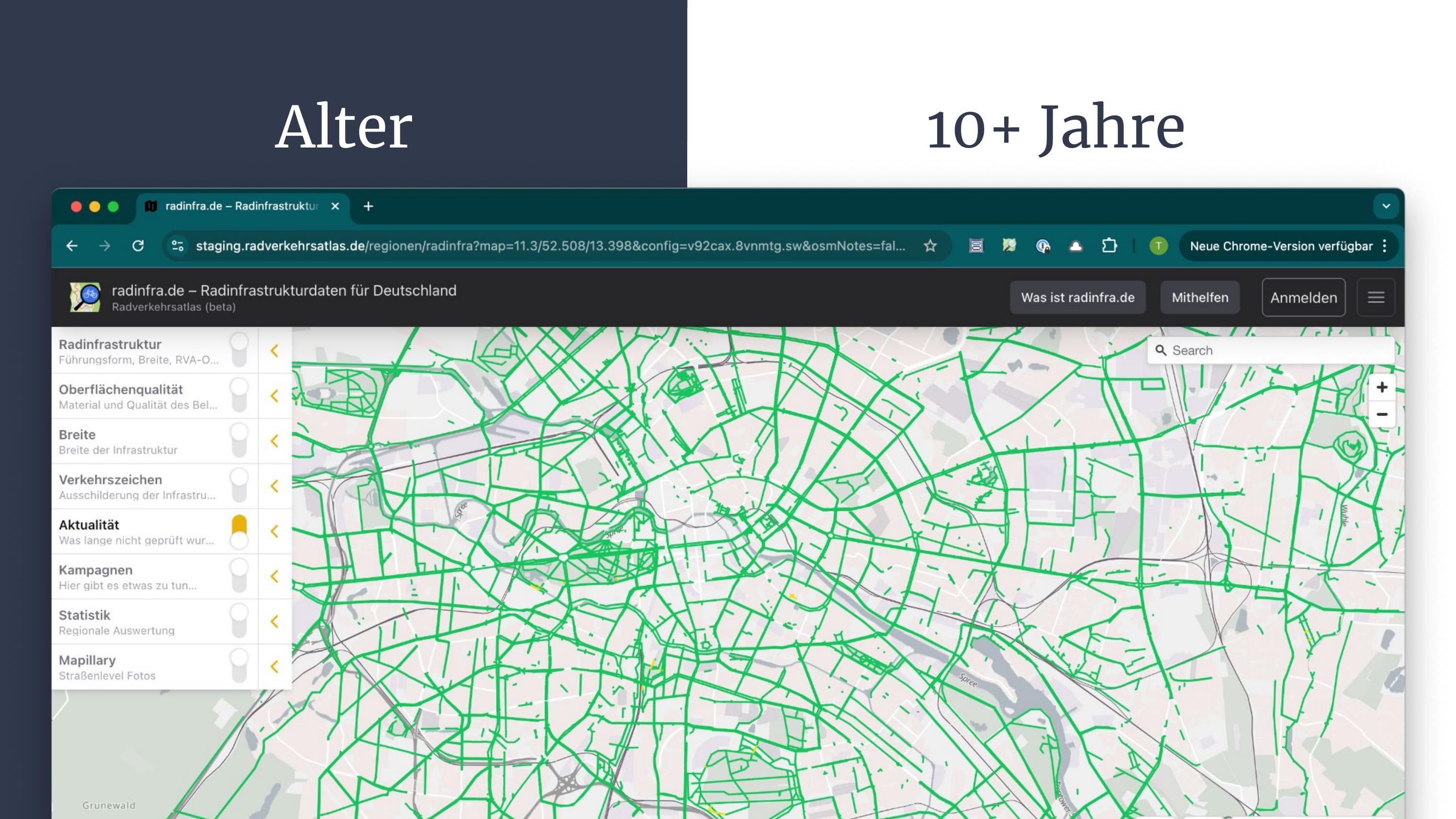 Diese Qualität macht OSM für Verwaltungen und die Zivilgesellschaft attraktiv – beispielsweise bei der Planung von Radinfrastruktur. Häufig ist OSM bereits die bessere Datengrundlage, da bestehende Daten entweder ganz fehlen oder nach sehr unterschiedlichen Kriterien erhoben wurden.